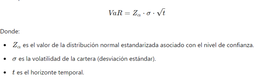 El VaR para una cartera de activos se calcula con la fórmula: